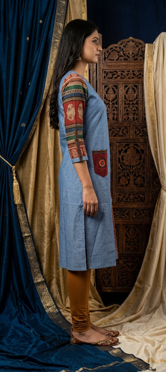 Designer Embroidered Long Kurti with Pocket - DENIM MELANGE