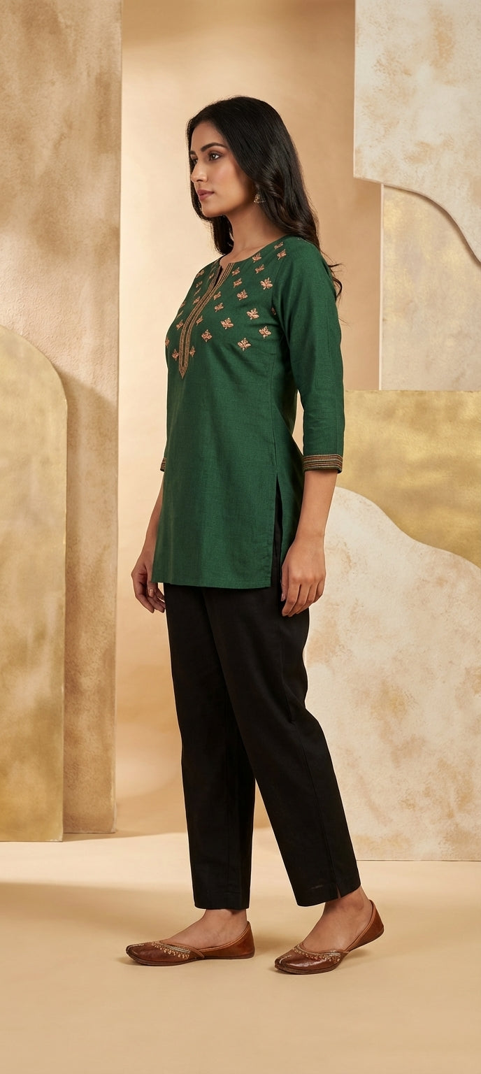Ethnic Thread Embroidery Bottle Green Short Kurti