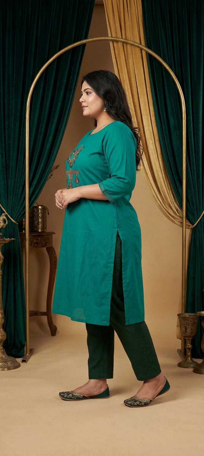 Graceful Thread Embroidered Ethnic Long Kurti -C GREEN