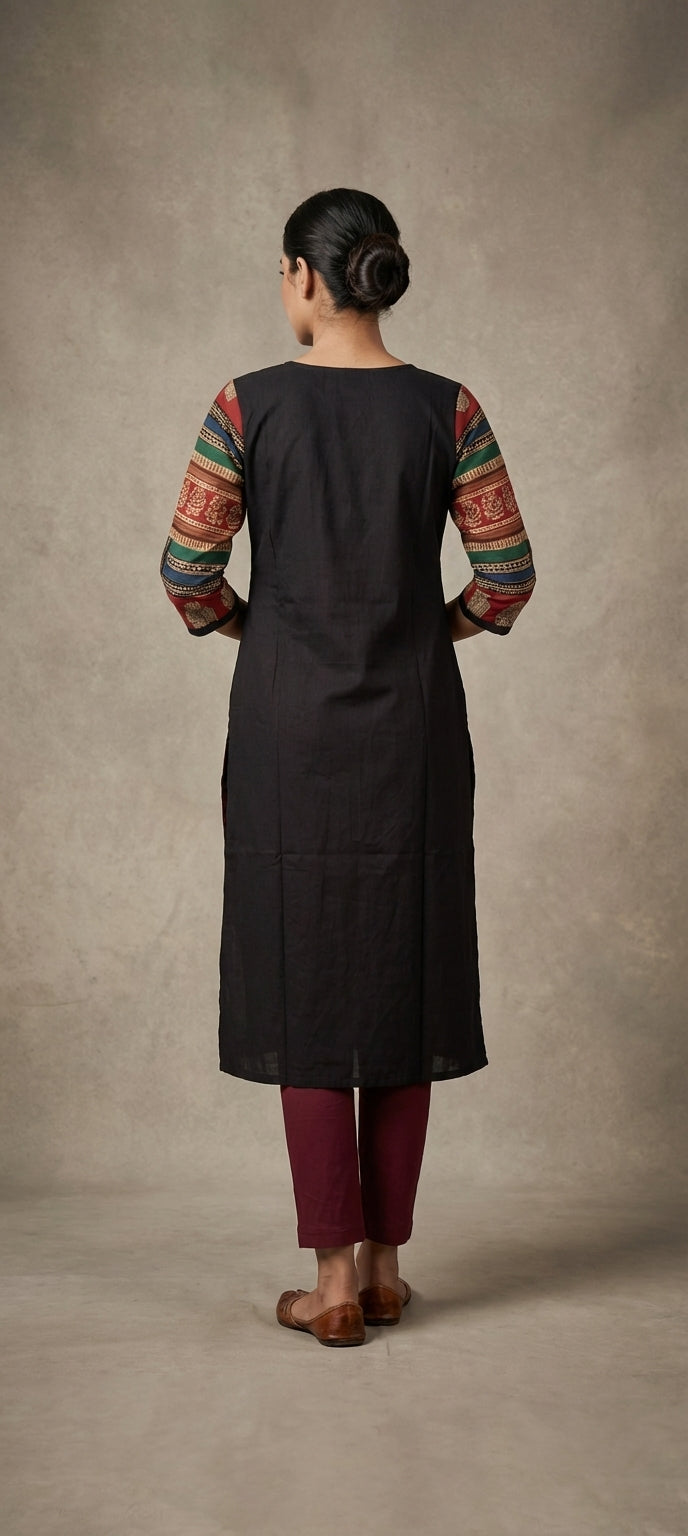 Traditional Mirror Work Embroidery Straight Long Kurti - BLACK